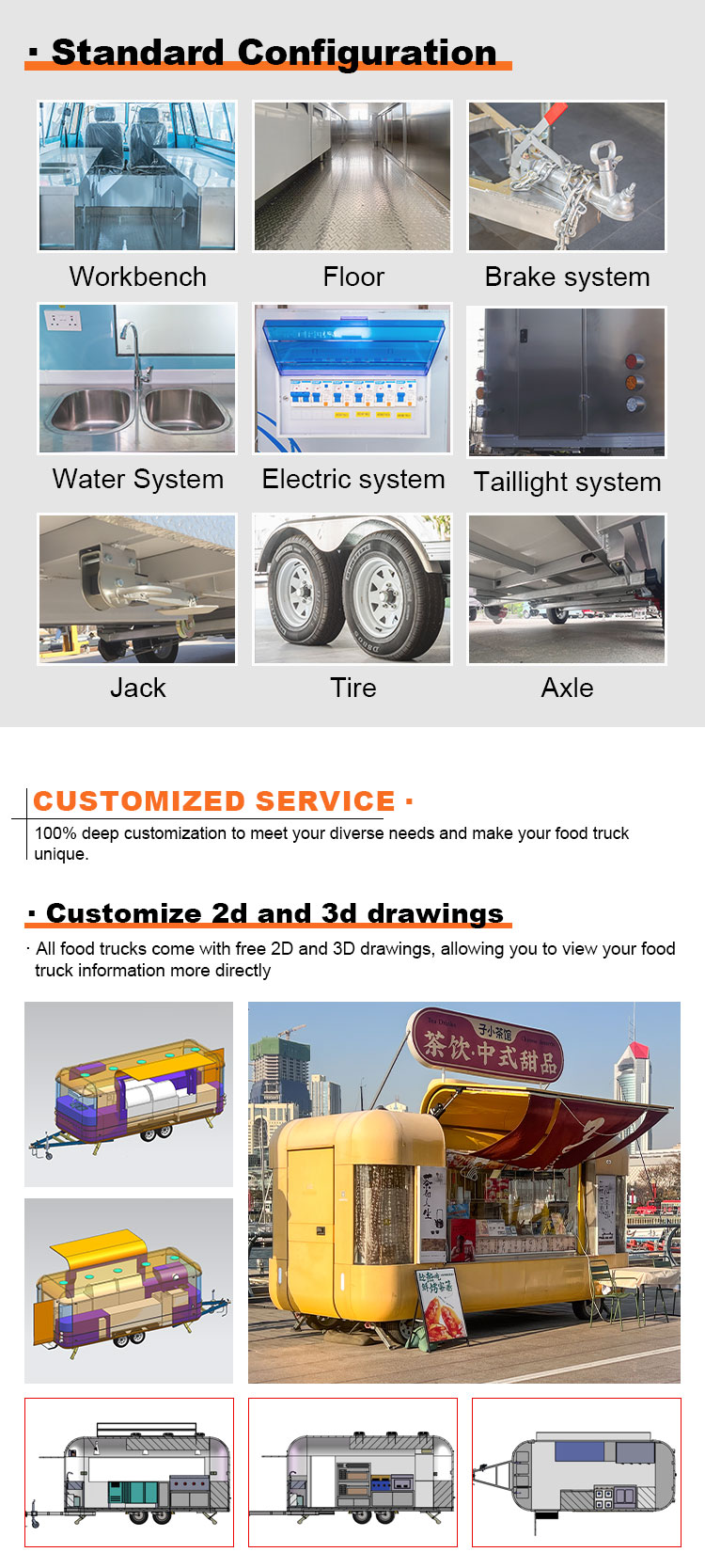 Til hovedmaterialet valgte vi højkvalitets 304 rustfrit stål, som er kendt for sin fremragende korrosionsbestandighed og fremragende holdbarhed og kan opretholde stabil ydeevne under en række forskellige miljøforhold, hvilket sikrer, at vores Coffee Cart Mobile-produkter kan bevare deres fremragende kvalitet og funktionalitet selv på lang sigt og står over for en række udfordringer. 304 rustfrit ståls fremragende korrosionsbestandighed, så Lastbilen ikke er let at blive ramt af oxidation eller rust, hvilket i høj grad forlænger dens levetid. Den fremragende korrosionsbestandighed af 304 rustfrit stål gør lastbilen mindre modtagelig for oxidation eller rust, hvilket i høj grad forlænger deres levetid.