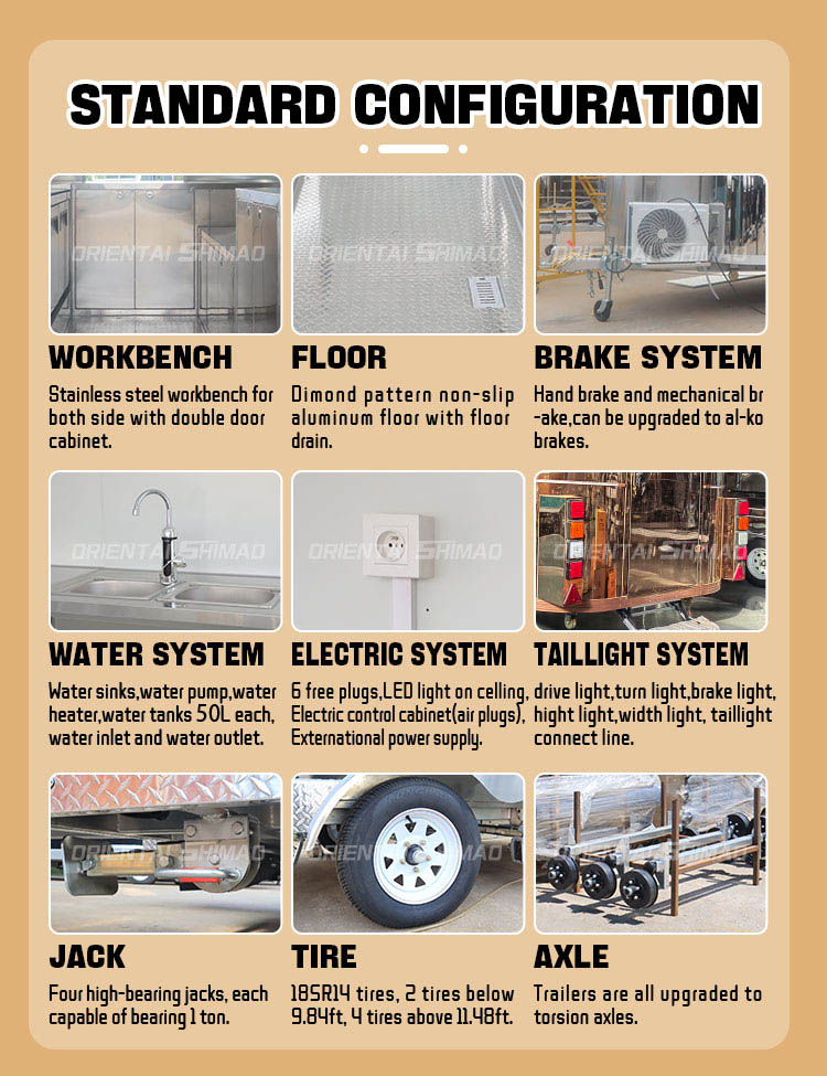 Til hovedmaterialet valgte vi højkvalitets 304 rustfrit stål, som er kendt for sin fremragende korrosionsbestandighed og fremragende holdbarhed og kan opretholde en stabil ydeevne under en række forskellige miljøforhold, hvilket sikrer, at vores Corporate Catering Kitchen Van Corporate Catering Kitchen Vanom Food Trailer ikke er let at blive påvirket af oxidation eller rust, hvilket i høj grad forlænger dens levetid. Den fremragende korrosionsbestandighed af 304 rustfrit stål gør Corporate Catering Kitchen Van mindre modtagelig for oxidation eller rust, hvilket i høj grad forlænger deres levetid.