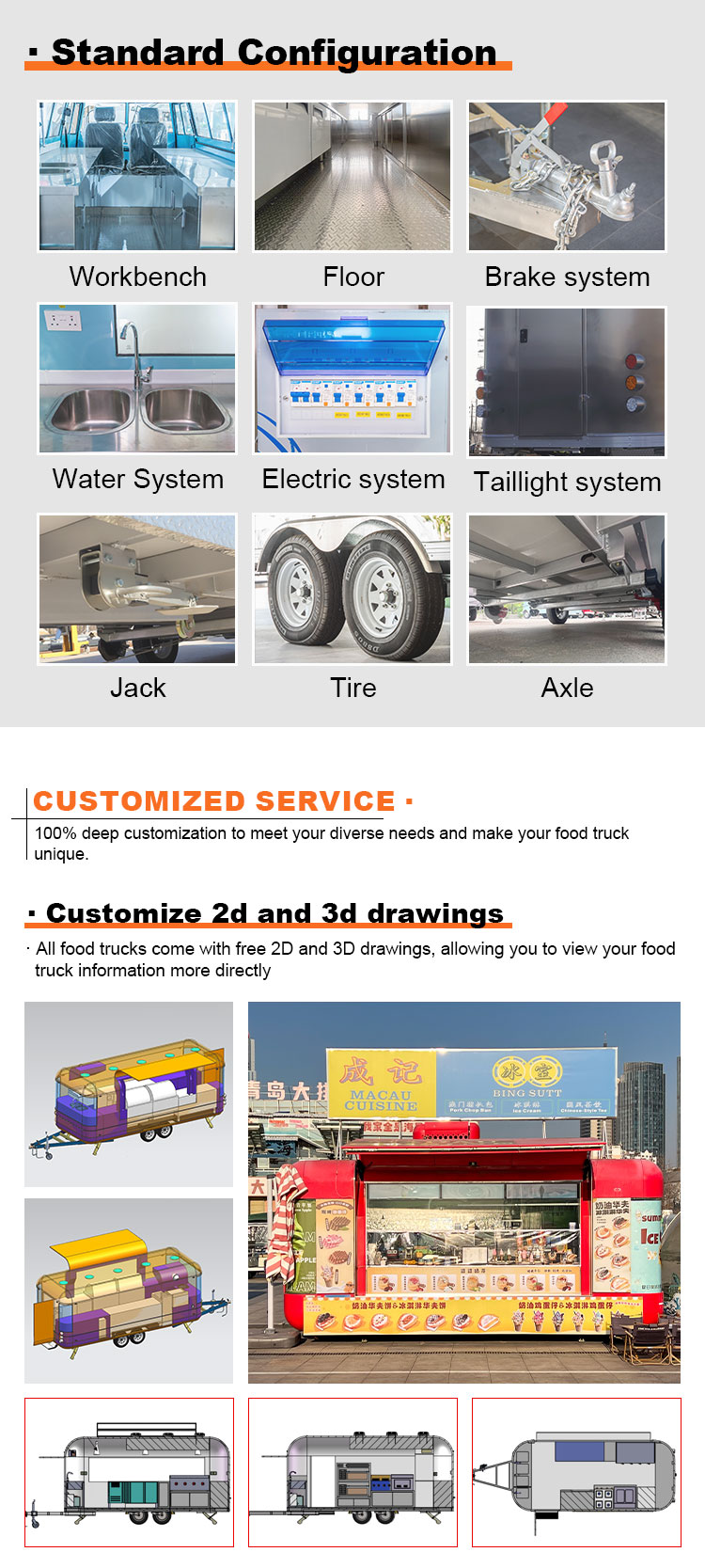 Til hovedmaterialet valgte vi højkvalitets 304 rustfrit stål, som er kendt for sin fremragende korrosionsbestandighed og fremragende holdbarhed, og som kan opretholde en stabil ydeevne under en række forskellige miljøforhold, hvilket sikrer, at vores Food Catering Trailers produkter kan bevare deres fremragende kvalitet og funktionalitet selv på lang sigt og stå over for en række udfordringer. 304 rustfrit ståls fremragende korrosionsbestandighed, så Lastbilen ikke er let at blive ramt af oxidation eller rust, hvilket i høj grad forlænger dens levetid. Den fremragende korrosionsbestandighed af 304 rustfrit stål gør lastbilen mindre modtagelig for oxidation eller rust, hvilket i høj grad forlænger deres levetid.