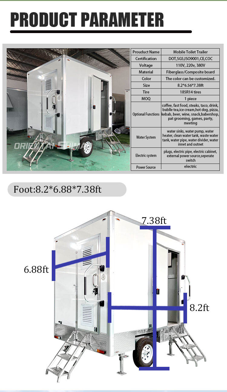 Oriental shimao Festival Portable Toilet til event er en bærbar toiletløsning designet til at imødekomme avancerede behov til alle typer store arrangementer, byggepladser, udendørs lejre og nødredningspladser. Ved at kombinere avanceret miljøteknologi med brugervenligt design giver dette sanitetskøretøj en komfortabel, sikker og effektiv toiletoplevelse, hvilket gør det til det bedste valg for moderne midlertidige sanitære faciliteter.