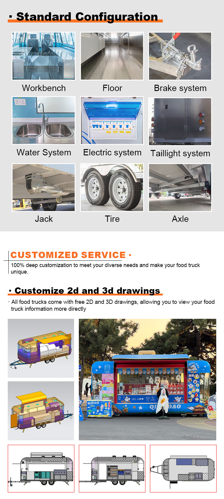 Til hovedmaterialet valgte vi højkvalitets 304 rustfrit stål, som er kendt for sin fremragende korrosionsbestandighed og fremragende holdbarhed, og som kan opretholde en stabil ydeevne under en række forskellige miljøforhold, hvilket sikrer, at vores Food Catering Trailers produkter kan bevare deres fremragende kvalitet og funktionalitet selv på lang sigt og stå over for en række udfordringer. 304 rustfrit ståls fremragende korrosionsbestandighed, så Lastbilen ikke er let at blive ramt af oxidation eller rust, hvilket i høj grad forlænger dens levetid. Den fremragende korrosionsbestandighed af 304 rustfrit stål gør lastbilen mindre modtagelig for oxidation eller rust, hvilket i høj grad forlænger deres levetid.