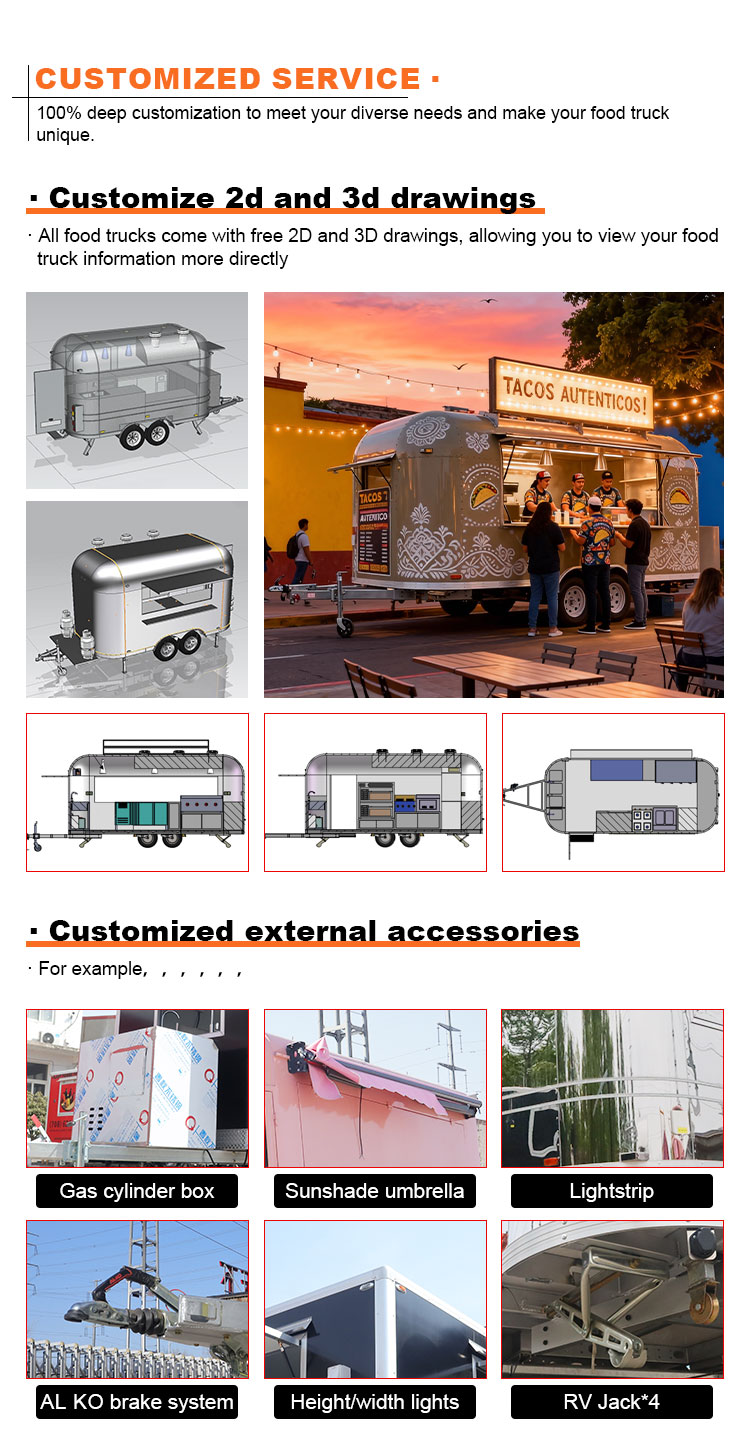 Til hovedmaterialet valgte vi højkvalitets 304 rustfrit stål, som er kendt for sin fremragende korrosionsbestandighed og fremragende holdbarhed, og som kan opretholde en stabil ydeevne under en række forskellige miljøforhold, hvilket sikrer, at vores Food Catering Trailers produkter kan bevare deres fremragende kvalitet og funktionalitet selv på lang sigt og stå over for en række udfordringer. 304 rustfrit ståls fremragende korrosionsbestandighed, så Lastbilen ikke er let at blive ramt af oxidation eller rust, hvilket i høj grad forlænger dens levetid. Den fremragende korrosionsbestandighed af 304 rustfrit stål gør lastbilen mindre modtagelig for oxidation eller rust, hvilket i høj grad forlænger deres levetid.