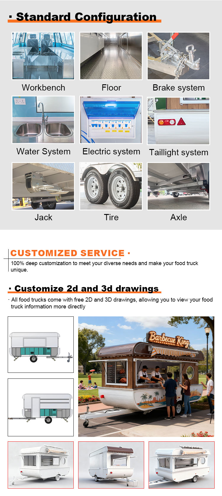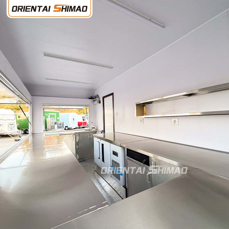 Til hovedmaterialet valgte vi højkvalitets 304 rustfrit stål, som er kendt for sin fremragende korrosionsbestandighed og fremragende holdbarhed, og som kan opretholde en stabil ydeevne under en række forskellige miljøforhold, hvilket sikrer, at vores Food Catering Trailers produkter kan bevare deres fremragende kvalitet og funktionalitet selv på lang sigt og stå over for en række udfordringer. 304 rustfrit ståls fremragende korrosionsbestandighed, så Lastbilen ikke er let at blive ramt af oxidation eller rust, hvilket i høj grad forlænger dens levetid. Den fremragende korrosionsbestandighed af 304 rustfrit stål gør lastbilen mindre modtagelig for oxidation eller rust, hvilket i høj grad forlænger deres levetid.