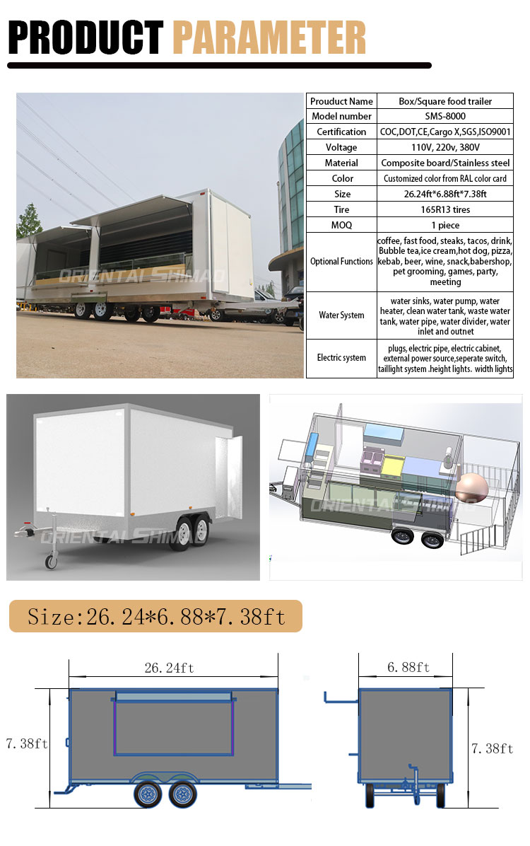 I det hurtige moderne liv er Oriental Shimao Food Trailer rustfrit stål med sin unikke charme og enestående fleksibilitet hurtigt blevet en skinnende stjerne i alle slags lejligheder, der fuldstændigt bryder grænserne for den traditionelle catering-forretningsmodel og integreres i og fører folks stadig mere rige og mangfoldige madkultur på en uudskrevet måde.