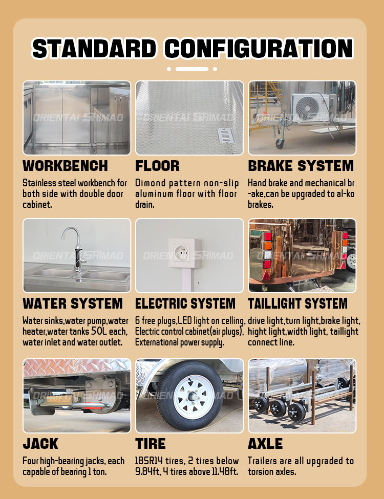 Til hovedmaterialet valgte vi højkvalitets 304 rustfrit stål, som er kendt for sin fremragende korrosionsbestandighed og fremragende holdbarhed, og som kan opretholde en stabil ydeevne under en række forskellige miljøforhold, hvilket sikrer, at vores Food Trailer With Full Kitchen-produkter kan bevare deres fremragende kvalitet og funktionalitet selv på lang sigt og stå over for en række udfordringer. 304 rustfrit ståls fremragende korrosionsbestandighed, så Lastbilen ikke er let at blive ramt af oxidation eller rust, hvilket i høj grad forlænger dens levetid. Den fremragende korrosionsbestandighed af 304 rustfrit stål gør lastbilen mindre modtagelig for oxidation eller rust, hvilket i høj grad forlænger deres levetid.