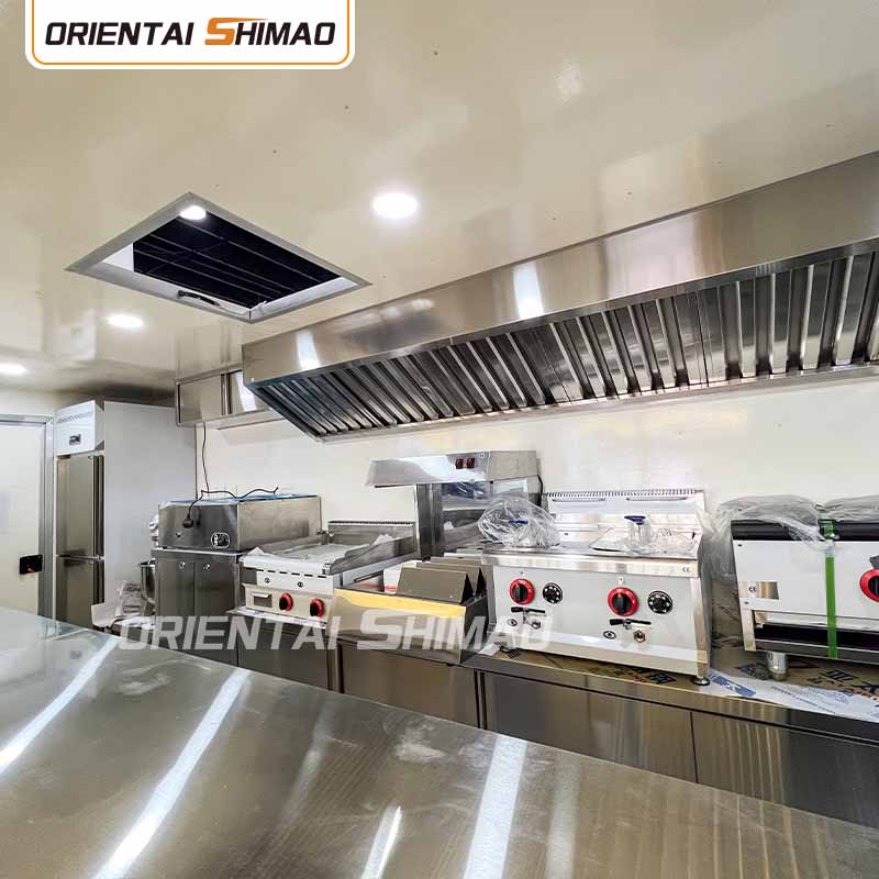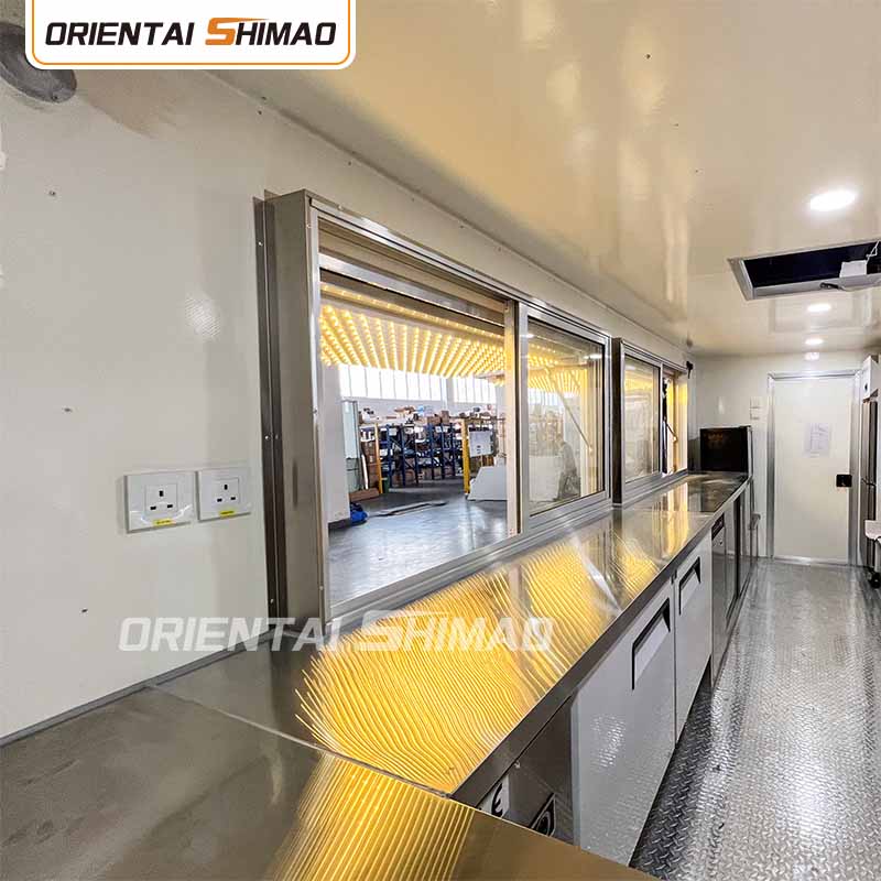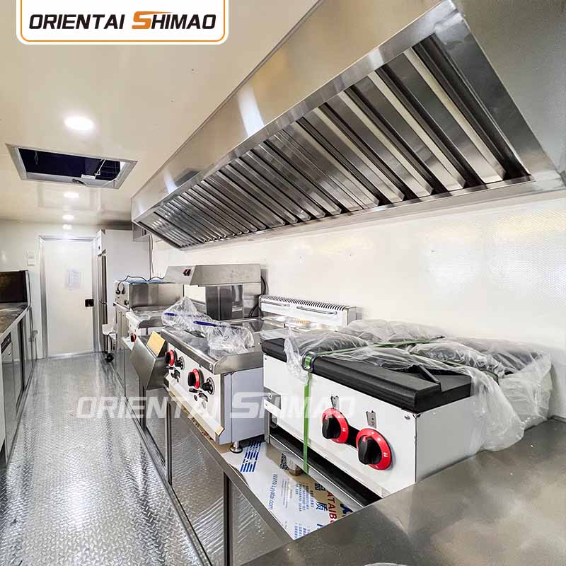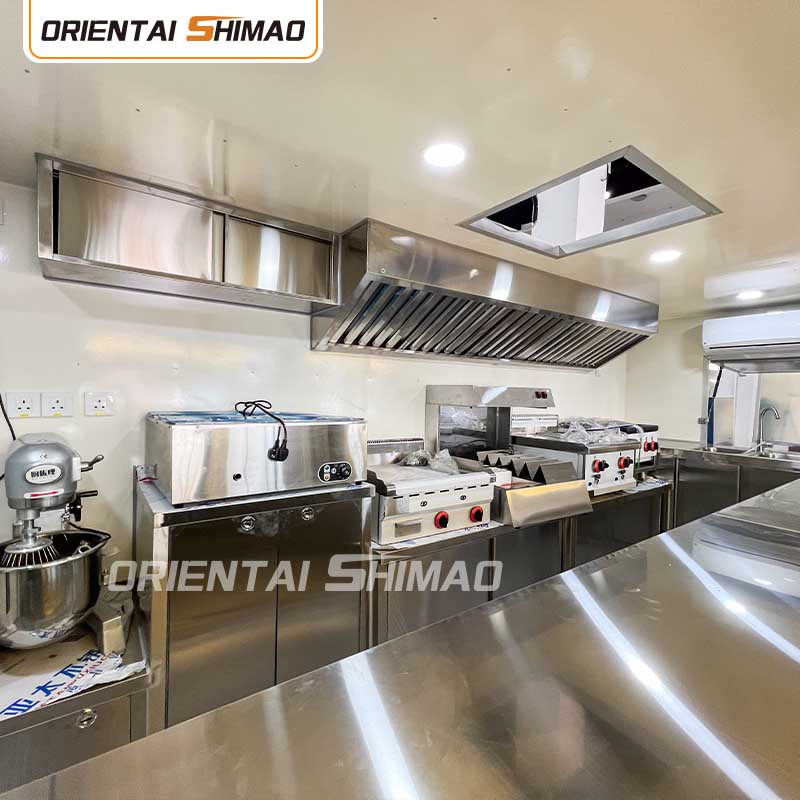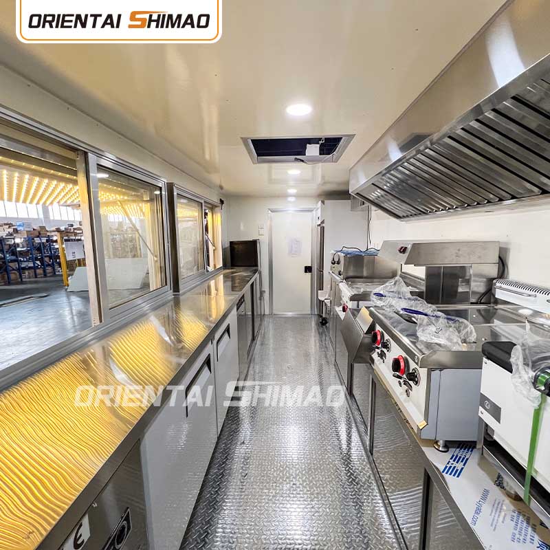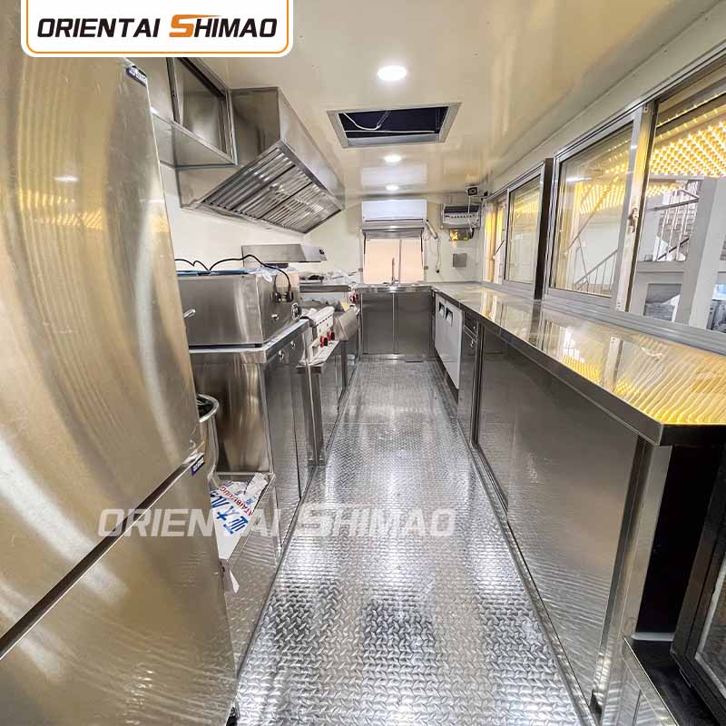 Rustfrit stål interiør: Interiøret er lavet af rustfrit stål, hvilket sikrer et stærkt og holdbart interiør, der er let at rengøre og vedligeholde og opfylder fødevarehygiejnestandarder. Brugen af rustfrit stål forbedrer ikke kun foodtruckens levetid, men sikrer også hygiejnen og sikkerheden ved madlavningsprocessen.