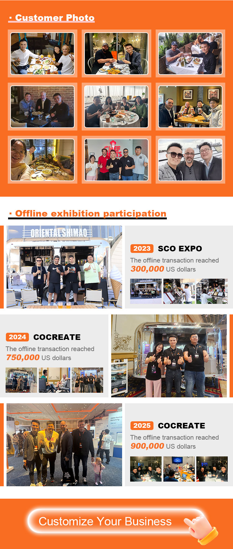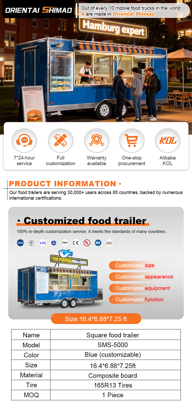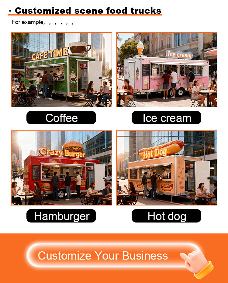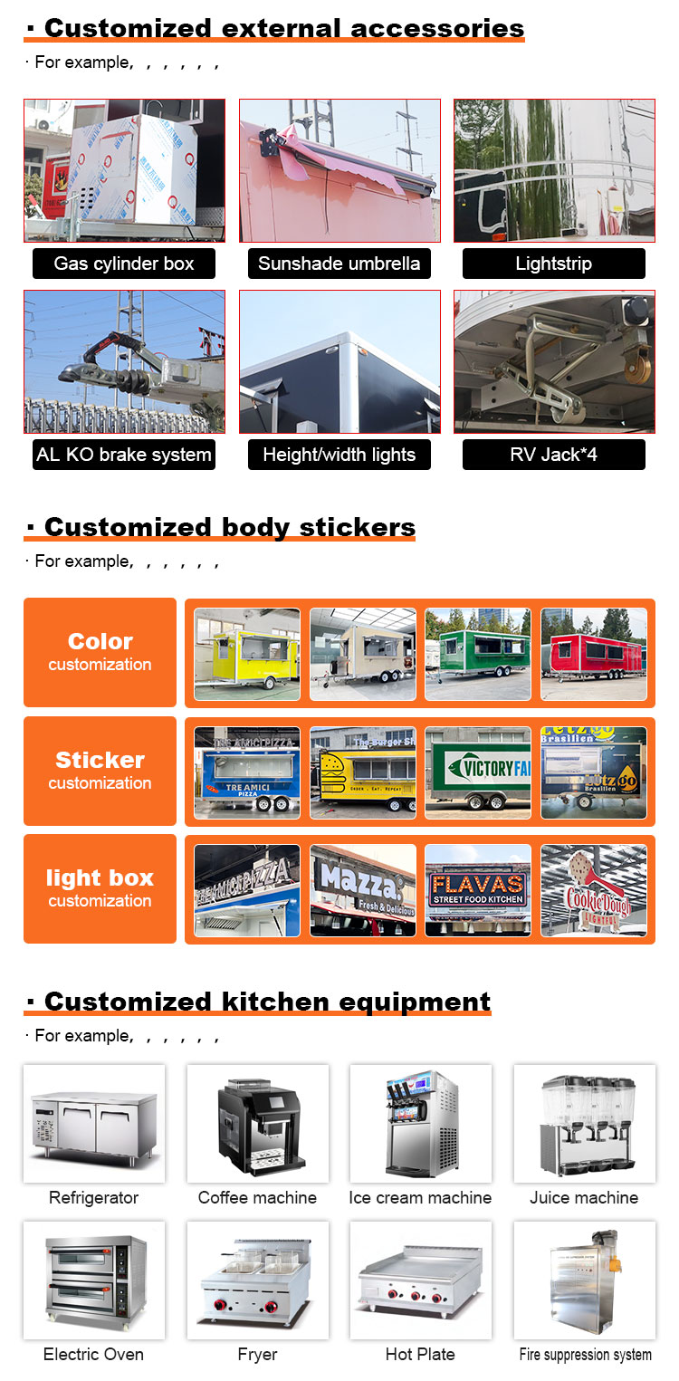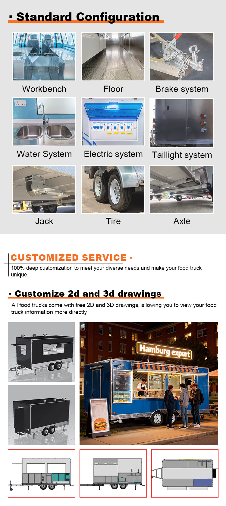 Modellering og stil: Udseendemodelleringen og stilen på foodtrucken er en vigtig faktor for at tiltrække kunder. Det kan tilpasses efter kundernes mærkeimage, forretningsegenskaber eller personlige præferencer, såsom strømlinet design, retrostil, moderne enkelhed og så videre.