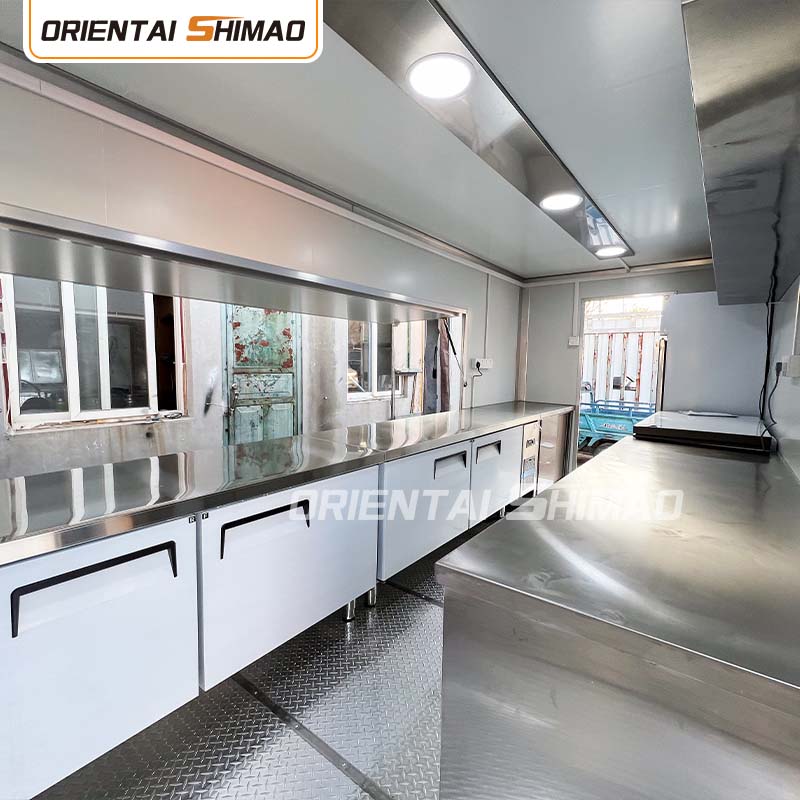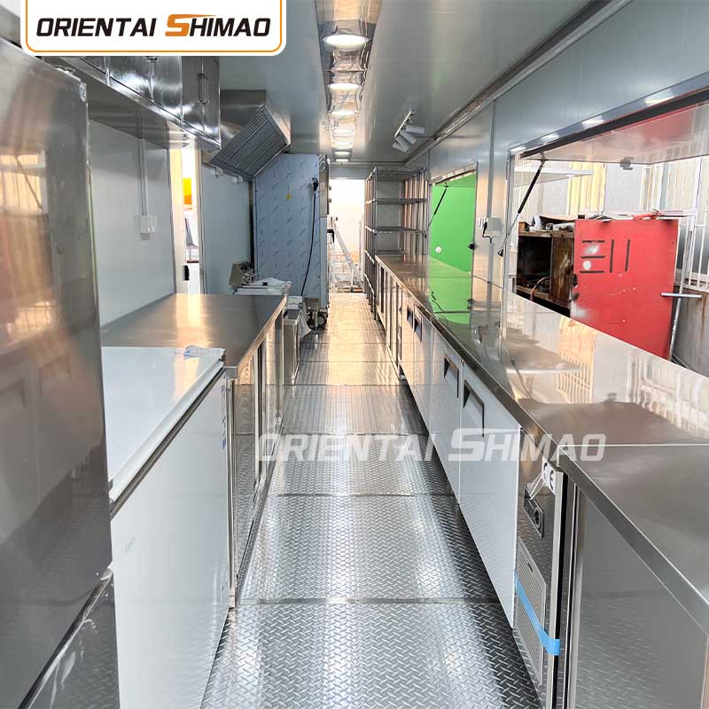 Rustfrit stål interiør: Interiøret er lavet af rustfrit stål, hvilket sikrer et stærkt og holdbart interiør, der er let at rengøre og vedligeholde og opfylder fødevarehygiejnestandarder. Brugen af rustfrit stål forbedrer ikke kun foodtruckens levetid, men sikrer også hygiejnen og sikkerheden ved madlavningsprocessen.