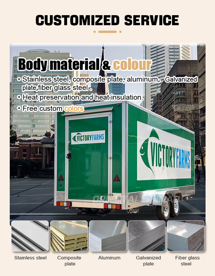 Materialetilpasning: Materialevalget er direkte relateret til foodtruckens holdbarhed, æstetik og sikkerhed. Vi tilbyder en bred vifte af kropsmaterialer, fra holdbar aluminiumslegering til letvægtskulfiber, fra klassisk rustfrit stål til energibesparende kompositmaterialer, hver med sine egne unikke fordele og anvendelsesscenarier. I mellemtiden er vi også opmærksomme på detaljerne, uanset om det er materialet på hjulene, robustheden af trækrammen eller donkraftens bekvemmelighed, vi tilpasser det efter dine faktiske behov for at sikre, at hver del af foodtrucken kan opnå den optimale ydeevne.