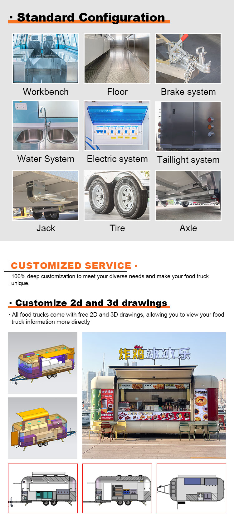 Til hovedmaterialet valgte vi højkvalitets 304 rustfrit stål, som er kendt for sin fremragende korrosionsbestandighed og fremragende holdbarhed, og som kan opretholde en stabil ydeevne under en række forskellige miljøforhold, hvilket sikrer, at vores Pizza Trucks-produkter kan bevare deres fremragende kvalitet og funktionalitet selv på lang sigt og stå over for en række udfordringer. 304 rustfrit ståls fremragende korrosionsbestandighed, så Lastbilen ikke er let at blive ramt af oxidation eller rust, hvilket i høj grad forlænger dens levetid. Den fremragende korrosionsbestandighed af 304 rustfrit stål gør lastbilen mindre modtagelig for oxidation eller rust, hvilket i høj grad forlænger deres levetid.