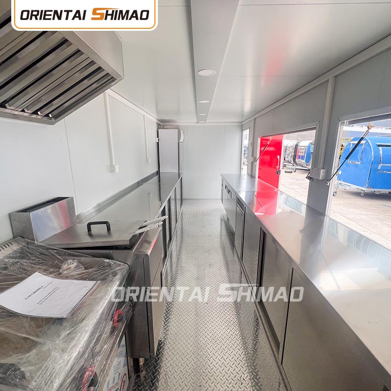 Rustfrit stål interiør: Interiøret er lavet af rustfrit stål, hvilket sikrer et stærkt og holdbart interiør, der er let at rengøre og vedligeholde og opfylder fødevarehygiejnestandarder. Brugen af rustfrit stål forbedrer ikke kun foodtruckens levetid, men sikrer også hygiejnen og sikkerheden ved madlavningsprocessen.
