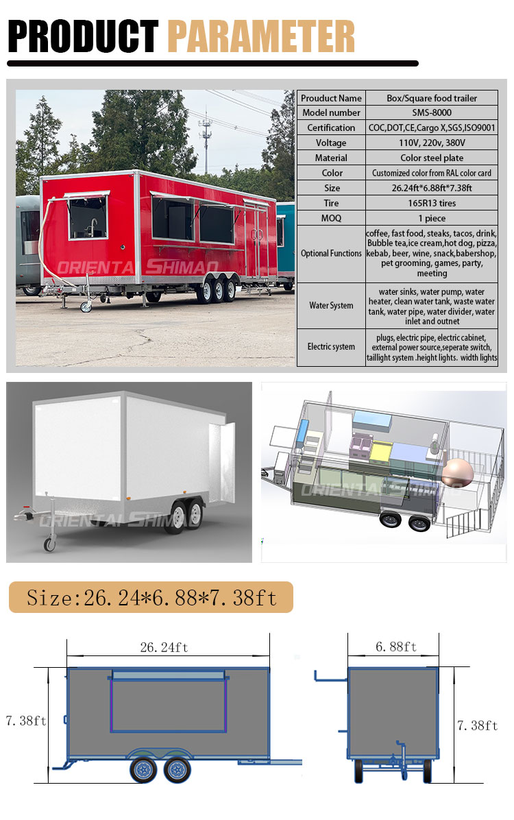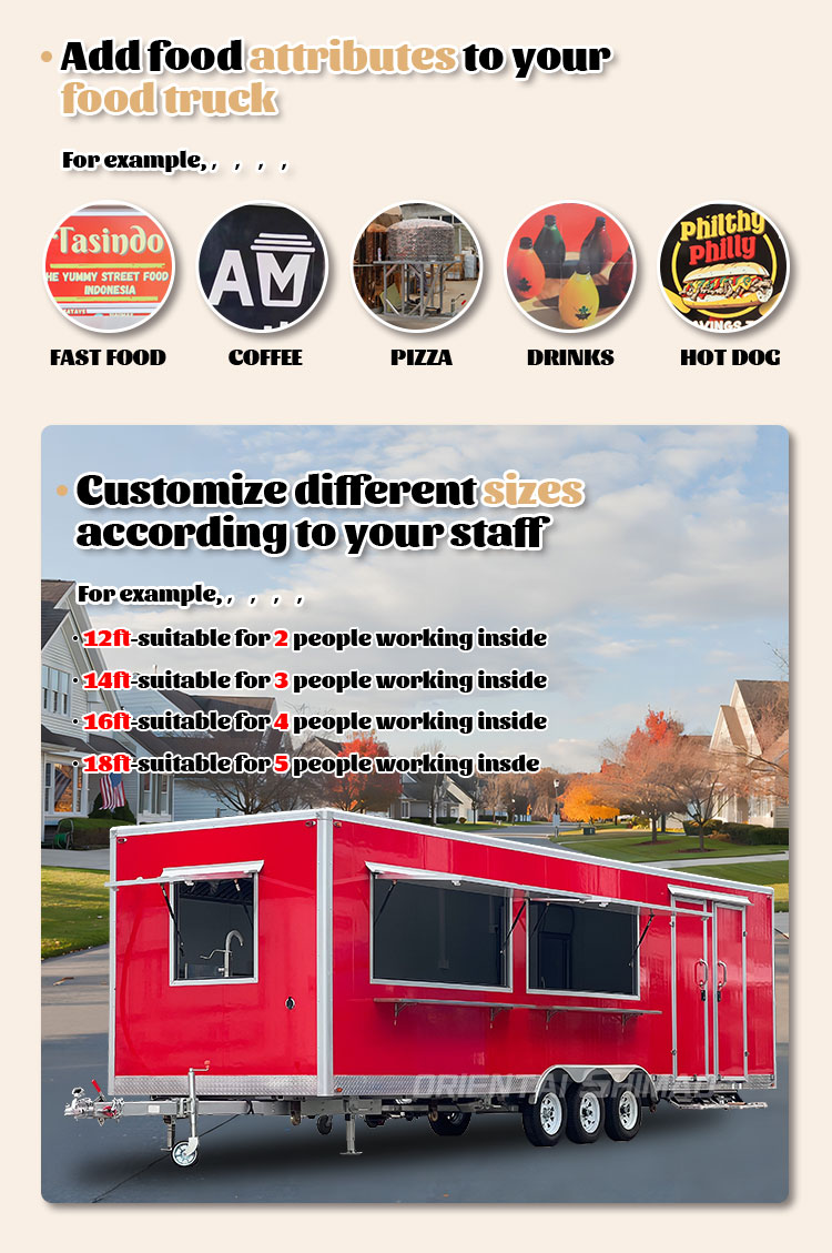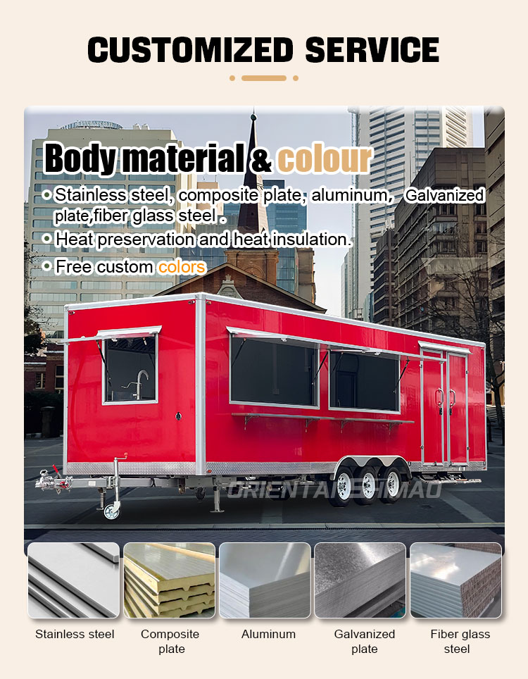 Modellering og stil: Udseendemodelleringen og stilen på foodtrucken er en vigtig faktor for at tiltrække kunder. Det kan tilpasses efter kundernes mærkeimage, forretningsegenskaber eller personlige præferencer, såsom strømlinet design, retrostil, moderne enkelhed og så videre.