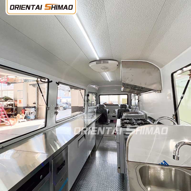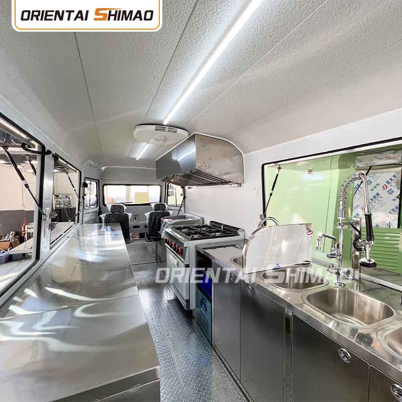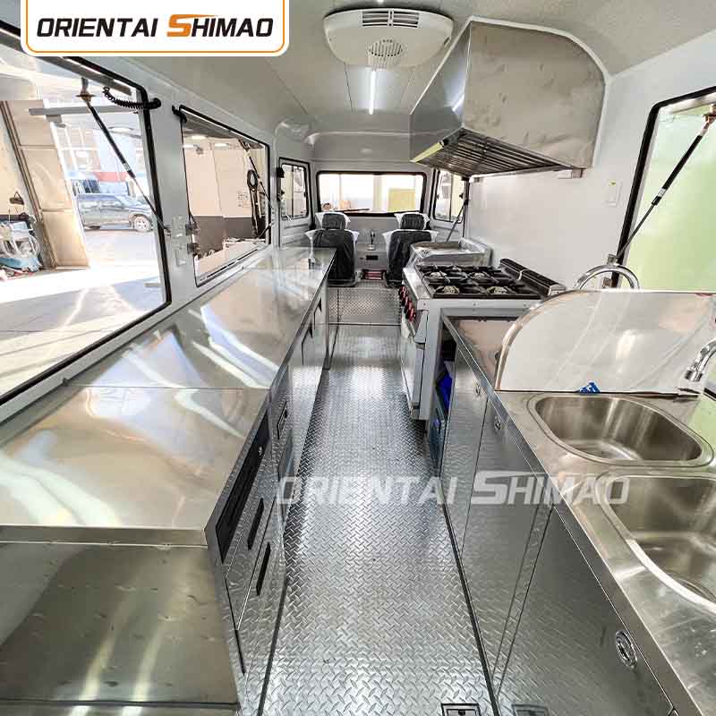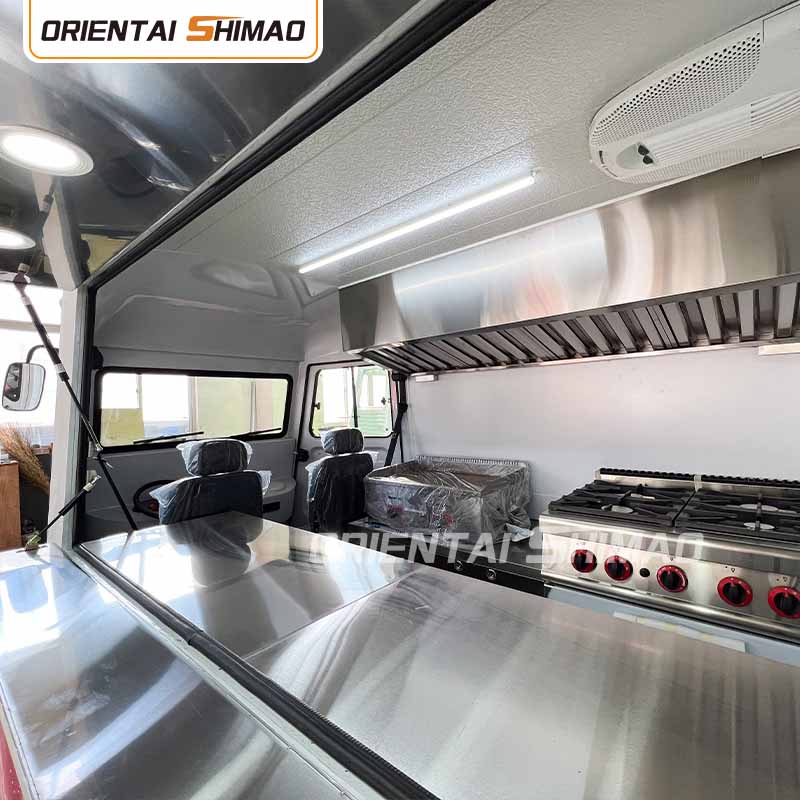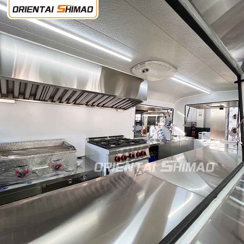 Rustfrit stål interiør: Interiøret er lavet af rustfrit stål, hvilket sikrer et stærkt og holdbart interiør, der er let at rengøre og vedligeholde og opfylder fødevarehygiejnestandarder. Brugen af rustfrit stål forbedrer ikke kun foodtruckens levetid, men sikrer også hygiejnen og sikkerheden ved madlavningsprocessen.