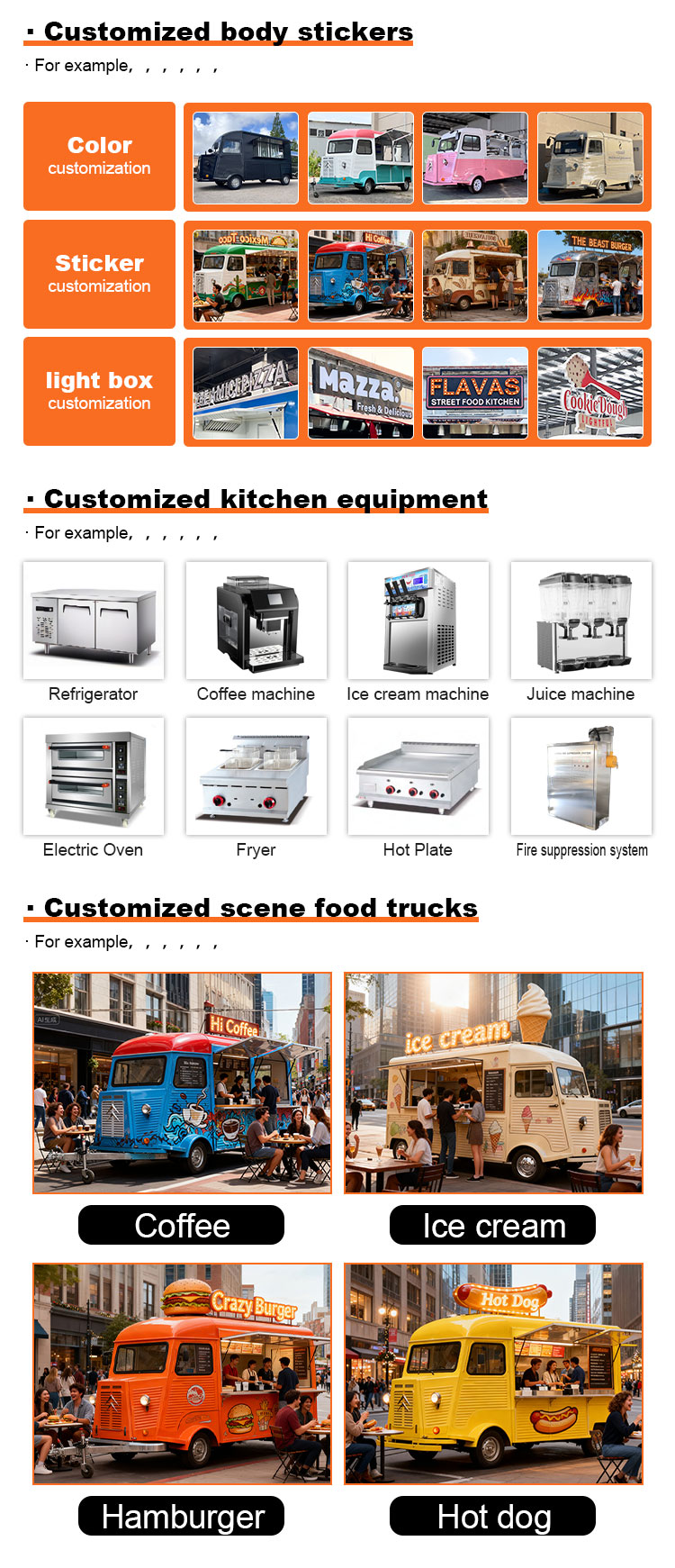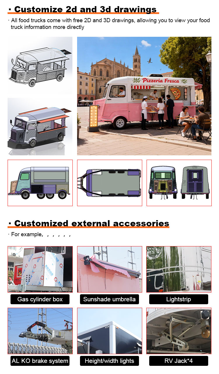 Modellering og stil: Udseendemodelleringen og stilen på foodtrucken er en vigtig faktor for at tiltrække kunder. Det kan tilpasses efter kundernes mærkeimage, forretningsegenskaber eller personlige præferencer, såsom strømlinet design, retrostil, moderne enkelhed og så videre.
